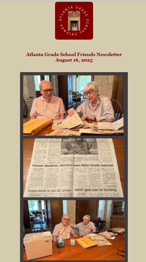 Begun in 2022, the newsletter shares the history of the school and the region, alumni memories of attending Atlanta-Miller Grade School, restoration updates, and future plans. The e-newsletter is published on the third Saturday morning of each month.